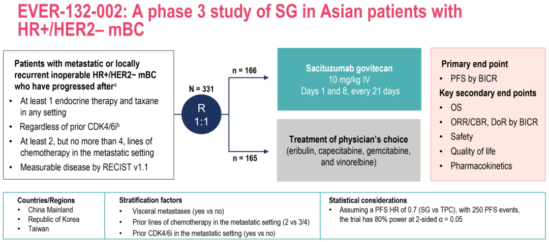 EVER-132-002研究设计与TROPiCS-02相似,共入组包括中国大陆、中国台湾、韩国在内的331例亚裔HR+/HER2-mBC患者,其中约70%来自中国大陆,要求患者既往接受过2-4次系统化疗,但对CDK4/6i经治与否不做限定。患者按1:1随机分组后分别予以SG或TPC治疗,主要终点是根据盲法独立中央审查(BICR;RECIST v1.1)确定的PFS。次要终点包括OS、客观缓解率(ORR)、根据BICR确定的临床获益率(CBR)以及安全性[4]