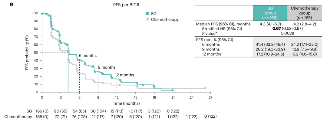 研究结果显示,SG较TPC改善了BICR评估的mPFS,为4.3 vs 4.2个月(HR,0.67 95%CI:0.52-0.87,P=0.0028);延长了mOS,为21.0个月vs.15.3个月(HR,0.64,95%CI:0.47-0.88,P=0.0061);安全性与既往研究表现相似,主要以血液毒性、腹泻为主,未见新的安全信号[5]