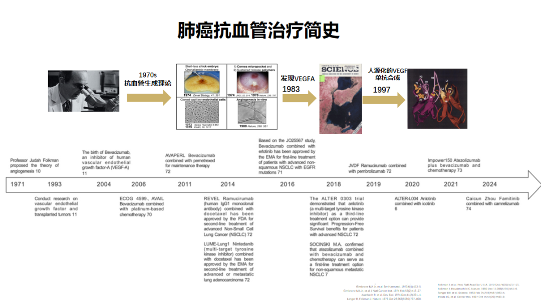 自20世纪70年代起,肺癌抗血管治疗理论萌芽,历经数十年,从基础理论探索至药物研发与临床应用,不断突破。血管内皮生长因子A(VEGFA)的发现、人源化VEGF单抗合成等关键节点不断推动其发展。