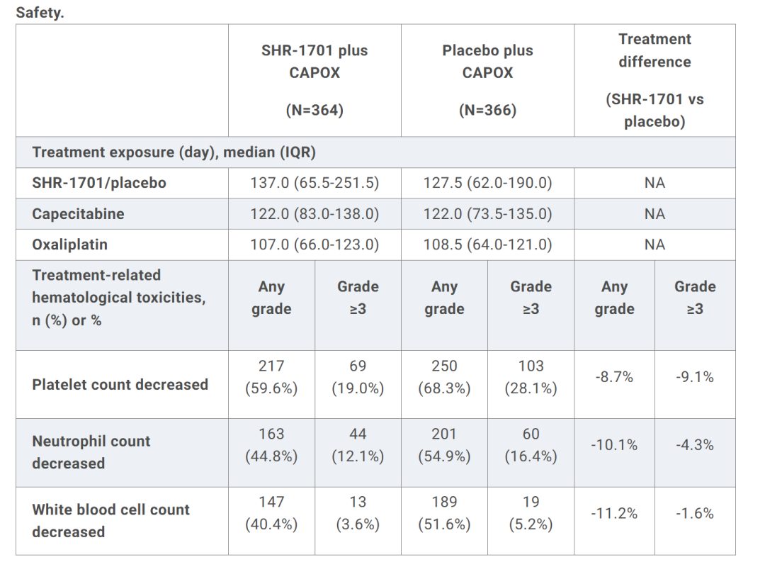 本次ASCO GI我们报道了SHR-1701对化疗导致骨髓抑制的一定改善作用。中位随访13.6个月显示,SHR-1701+CAPOX方案较CAPOX方案降低了降低了血小板减少、中性粒细胞减少、白细胞减少等所有骨髓抑制不良反应的发生率。