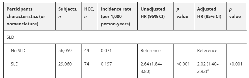 平均随访期为11.9年,123人新诊断为HCC。SLD患者的HCC发病率高于非SLD患者(0.197 vs.0.071/1000人年,P<0.001)。SLD患者的HCC风险高于非SLD患者(多变量调整HR 2.02;95%CI 1.40~2.92)。