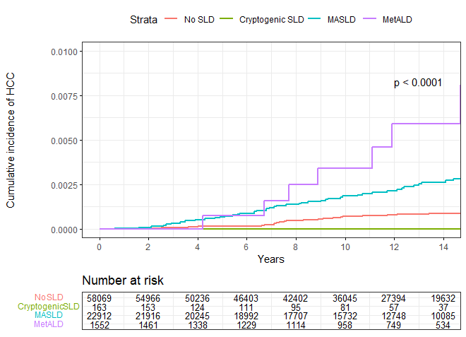 有2,423名参与者的HSI无法计算,共分析了82,696名参与者。患SLD个体的HCC发病率高于非SLD个体(0.238/每1,000人年vs.0.059/每1,000人年,P<0.001)。患SLD个体的HCC风险高于非SLD个体,多变量调整后的HR为4.54(95%CI 2.99~6.90,P<0.001)。隐源性SLD的HCC发病率为0/每1,000人年,MASLD为0.224/每1,000人年,MetALD为0.509/每1,000人年(P<0.001)。