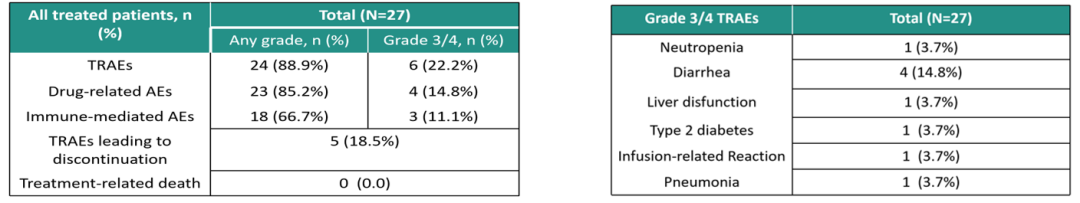 安全性方面,最常见的不良事件是腹泻、恶心、疲劳以及中性粒细胞减少症,仅6例患者出现3/4级不良事件,未见新的安全性信号(图8)。