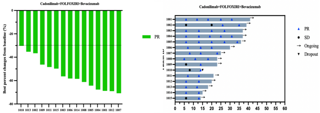 本研究共纳入20例患者,中位年龄65.5岁,55%有≥3个器官转移灶,35%存在RAS/BRAF突变。中位随访时间5个月,15例患者接受了≥2次影像学评估,ORR、DCR均为100%(图5),PFS、OS尚不成熟。安全性方面TRAE多为1-2级,未见新的安全性信号。