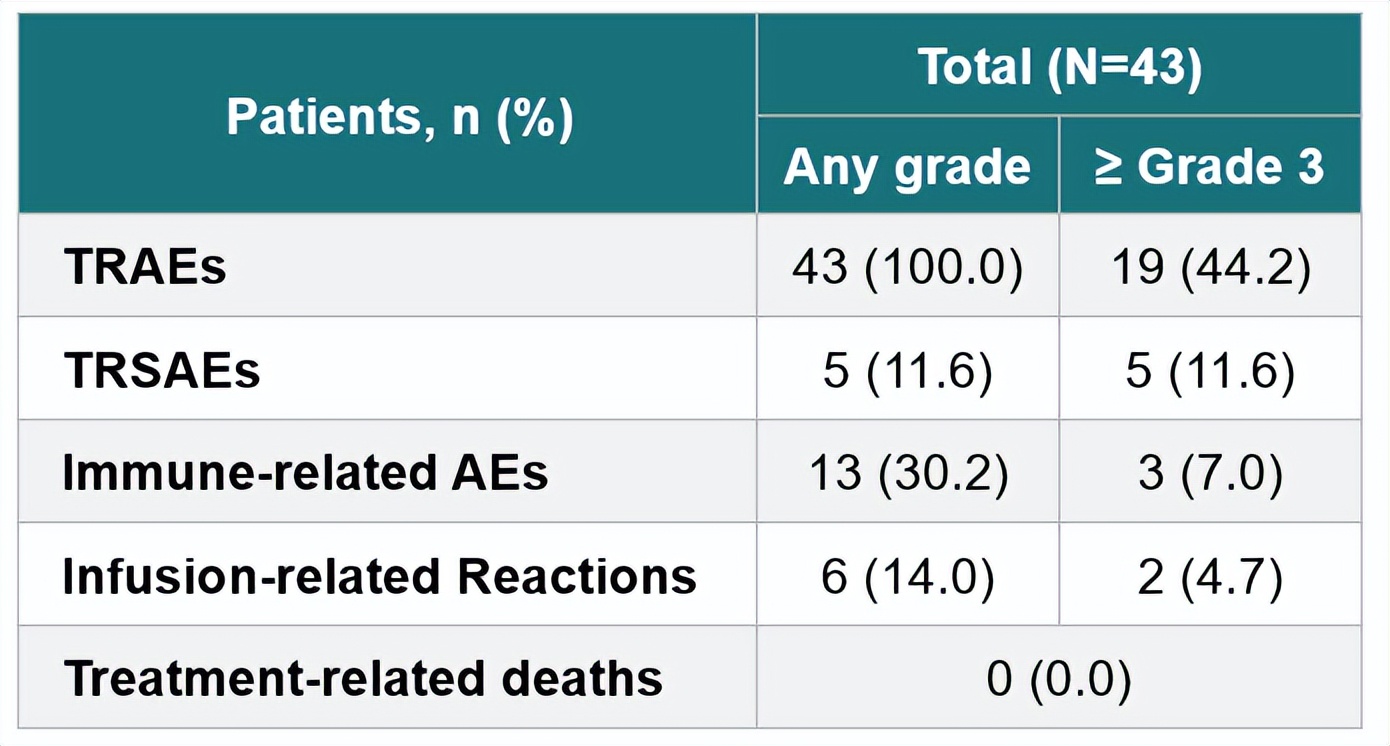 亚组分析显示,在PD-L1 CPS≥10的人群中,ORR为100.0%,mPFS为7.10个月。在PD-L1 CPS<10的人群中,ORR为77.3%,mPFS为7.26个月。六个超甲基化的CpG位点(EPTIN9、PKNOX2、DLEU7、SOX7、CNRIP1、LINC00554)可能是潜在的生物标志物。在安全性方面,≥3级治疗相关不良事件(TRAEs)发生率为44.2%(图3),主要包括中性粒细胞减少症、白细胞减少症和低钠血症,未见治疗相关死亡。