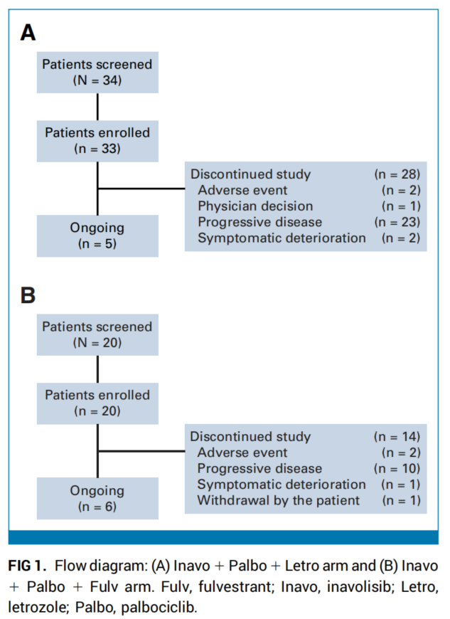 研究纳入了年龄≥18岁且携带PIK3CA突变的肿瘤患者。分别接受伊那利塞、哌柏西利和来曲唑(Inavo+Palbo+Letro组;来曲唑组)/氟维司群(Inavo+Palbo+Fulv组;氟维司群组)治疗,直至出现不可接受的毒性或疾病进展。评估来曲唑组在I期和II期剂量扩展阶段采用了3+1+3的剂量递增设计;而评估氟维司群组则在进行II期剂量扩展前设置了一个安全性导入期。