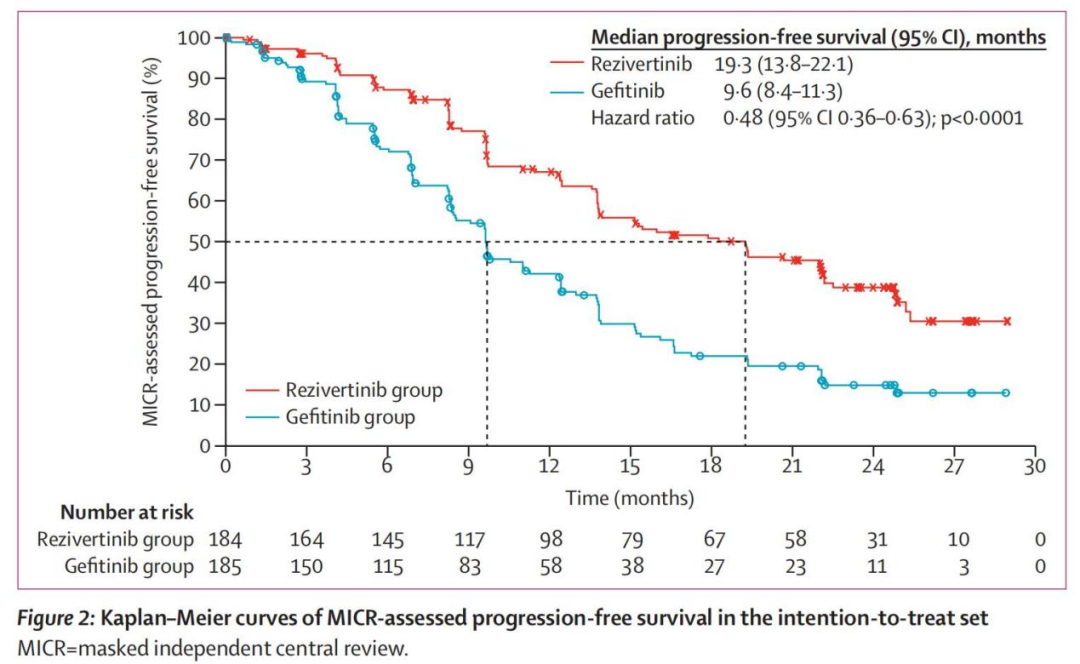 研究方法:这是一项随机、双盲、III期临床研究。纳入组织病理学确认的局部晚期或转移性NSCLC患者,患者携带19del或21L858R突变。符合入组标准的患者按照1:1的比例随机分为Rezivertinib 180mg,口服,每日一次或吉非替尼250mg,口服,每日一次,直至疾病进展或出现不可耐受的毒性反应,每21天为一个治疗周期。主要研究终点为独立评审委员会基于ITT人群分析的PFS。目前,研究仍在随访中。