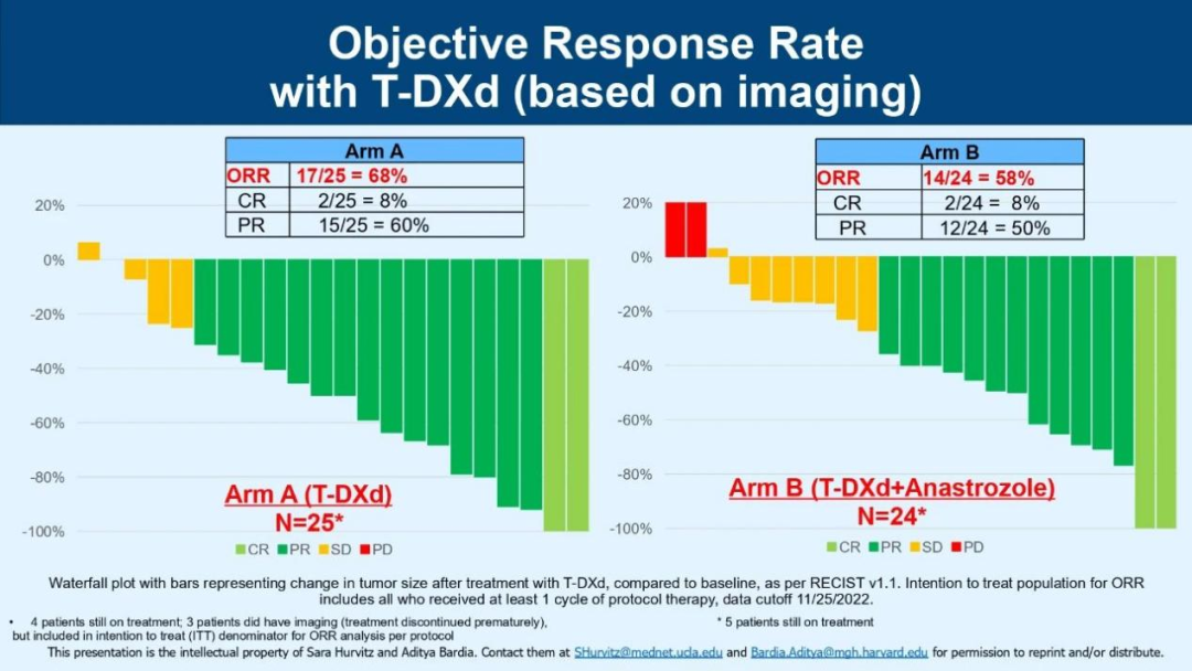 张慧敏教授:在HR+早期乳腺癌患者的治疗中,新辅助多药化疗的pCR率其实并不高,而且多药化疗会带来许多不可耐受的副作用,给病人的治疗带来困扰。因此,临床存在未被满足的需求。当前,无论是原研的进口ADC药物T-DXd,还是国产的ADC类药物SHR-A1811,都在新辅助治疗阶段探索了单药或联合用药的疗效。TALENT研究首次探索了T-DXd单药或联合内分泌治疗在HR+/HER2低表达早期乳腺癌新辅助治疗中的疗效和安全性。研究结果显示,T-DXd单药组的ORR率为68%,联合内分泌治疗组的ORR率为58%,这表明靶向HER2的ADC药物T-DXd在该患者群体中具有一定的临床潜力,需要进一步筛选获益人群。