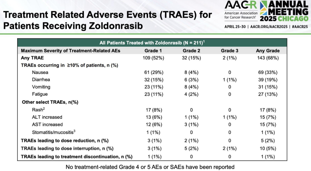 在211例接受Zoldonrasib治疗的患者中,治疗相关不良反应(TRAE)大多为1级(52%);15%的患者出现2级事件,1%的患者出现3级事件。值得注意的是,未观察到4-5级TRAE或严重不良反应。因此,每日一次1200 mg已被确定为II期临床试验的推荐剂量。最常见的TRAE(≥10%的患者报告)包括恶心、腹泻、呕吐和疲劳。2%的患者(n=211)因TRAE减少剂量,5%的患者中断服药,仅1例患者因TRAE而停止治疗。