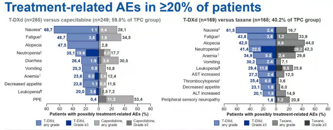 图5.T-DXd对比卡培他滨和紫杉类的常见不良事件