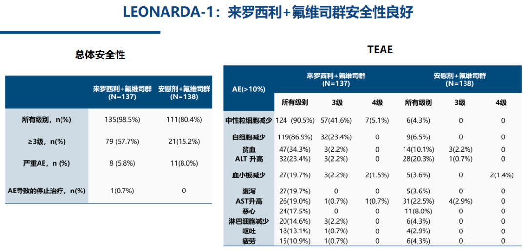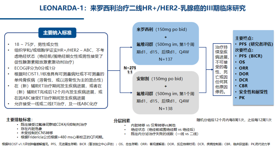 LEONARDA-1(NCT05054751)是由中国医学科学院肿瘤医院徐兵河教授牵头的一项随机、双盲、III期研究,旨在评估来罗西利在中国人群既往接受内分泌治疗后疾病复发或进展的HR+/HER2-晚期或转移性乳腺癌患者中的疗效和安全性。该研究共纳入了275名中国患者,并按1:1的比例随机分配,接受来罗西利(137名患者,150mg,每日两次)或安慰剂(138名患者)联合氟维司群的治疗。