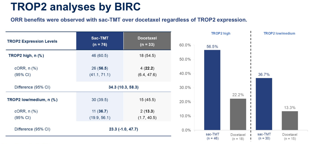 在肿瘤缓解方面,经BIRC评估,芦康沙妥珠单抗组的ORR为45.1%,相较于多西他赛组(15.6%),显著提高28.9%,达到了该研究的主要终点。而且,无论TROP2表达水平如何,芦康沙妥珠单抗组的ORR获益均显著优于多西他赛组。