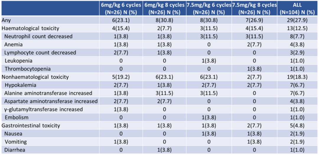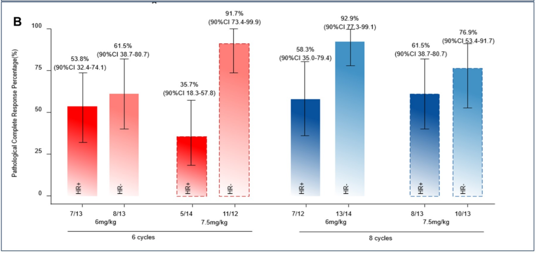 该研究入组人群为II至III期疾病的HER2阳性乳腺癌患者,随机接受TQB2102新辅助治疗,剂量为每3周6mg/kg或7mg/kg,共6个周期(A组)或8个周期(B组)。当然,徐瑞华教授汇报的1期剂量爬坡研究中,6mg/kg和7.5mg/kg都是可行的剂量方案。总体来看,6周期方案和8周期方案的pCR率分别达59.6%和73.1%;而且安全性良好,总体人群中≥3级不良事件的发生率分别为27.9%。