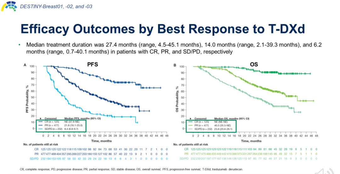 既往循证医学证据显示,CR是HER2阳性晚期乳腺癌OS延长的最强相关因素[7]。2024年ASCO报道的一项关于DESTINY-Breast01/02/03的汇总分析显示,对于完全缓解(CR)、部分缓解(PR)、稳定或进展(SD/PD)三种不同近期疗效人群,远期疗效mPFS、mOS与之密切相关。披露的数据显示,对于CR人群,mPFS和mOS均未达到;对于PR人群,mPFS为21.8个月,mOS为40.5个月;对于SD/PD人群,mPFS则为8.4个月,mOS为23.6个月(图3)[8]。可见T-DXd经治后取得CR的患者,往往具有更长的PFS和OS。
