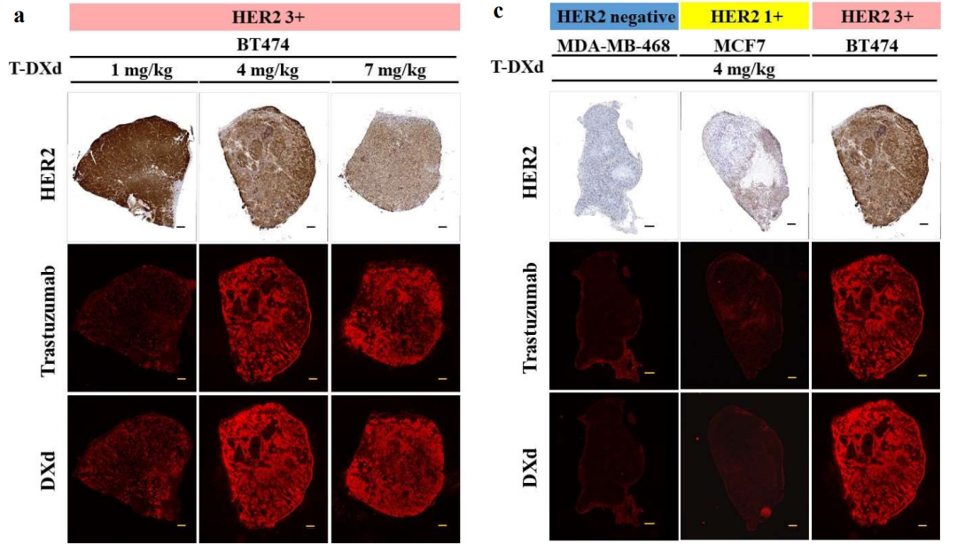 图2.荧光纳米颗粒成像技术:不同HER2表达水平的小鼠肿瘤模型中的T-DXd吸收分布(图源:参考文献[3])