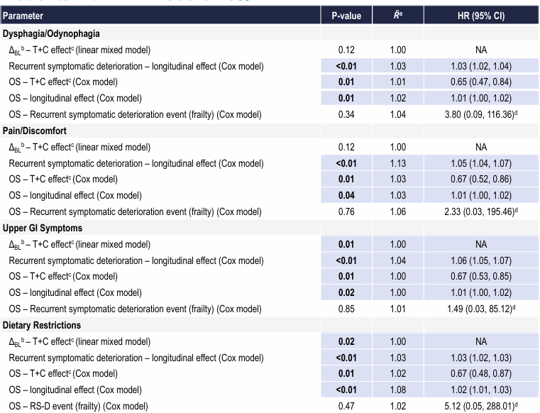 QLQ-STO22评分-联合生存模型结果显示,T+C组较P+C组显著改善上消化道症状与饮食限制(ΔBL–T+C效应),显著降低了所有PRO领域OS事件风险(OS–T+C效应),HR:0.65-0.67,反映死亡风险降低33%-35%。所有领域症状恶化均显著增加未来RS-D事件风险(RS-D纵向效应),HR:1.03-1.06,均P<0.01;所有PRO领域中,随时间发生恶化的症状,均显著增加死亡风险(OS纵向效应),HR:1.01-1.02,均P≤0.04。