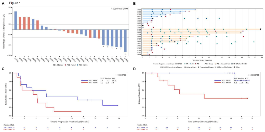 1、在26例被纳入疗效可评价集的患者中,总体ORR达23.1%(95%CI:9.0–43.6),其中PD-1初治人群(队列1)ORR为40.0%,而PD-1经治人群(队列2)无客观缓解。中位PFS为4.2个月,其中队列1达5.7个月,队列2为3.8个月。