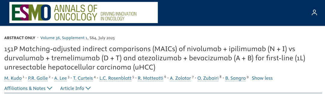 151P Matching-adjusted indirect comparisons(MAICs)of nivolumab+ipilimumab(N+I)vs durvalumab+tremelimumab(D+T)and atezolizumab+bevacizumab(A+B)for first-line(1L)unresectable hepatocellular carcinoma(uHCC)Kudo,M.et al.Annals of Oncology,Volume 36,S64