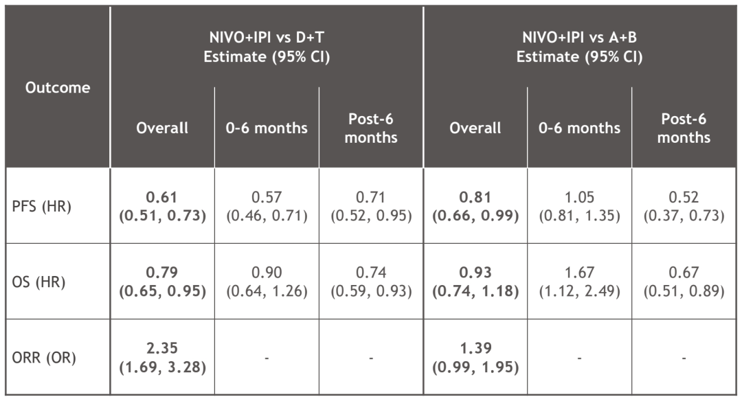 在缺乏头对头随机对照研究的情况下,MAIC分析显示N+I对比其他免疫治疗具有全面疗效优势。N+I较D+T在所有分析期(总体、0-6个月期间和6个月后)、较A+B在总体及6个月后分析具有更好的PFS、OS获益;N+I方案安全性总体可控。因此,本研究结果可为uHCC一线免疫联合方案的选择提供依据。