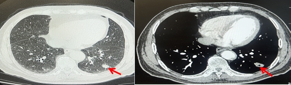 71岁男性,高血压病史20年,口服药物治疗,无糖尿病、心脏病等基础疾病,吸烟史50年,20支/天,已戒1年余,无饮酒史,无肿瘤家族史。2023.11因咳嗽、咳痰行胸CT检查:左肺下叶占位性病变,大小约12mmx8mm(如图5)。2023.11.20行“单孔胸腔镜左肺中下叶切除、肺门及纵隔淋巴结清扫、胸膜粘连松解术”;术后病理:(左肺下叶)结合免疫组化鳞状细胞癌(中、低分化),局部见脉管内癌栓,未见确切神经侵犯,(气管切缘)净。(淋巴结)未见转移癌0/19(4组0/1;5组0/1;6组0/2;7组0/1;9组0/1;10组0/2;11组0/3;12组0/2;13组0/2;14组0/4)。术后分期pT1bN0M0 IA期,术后定期复查。