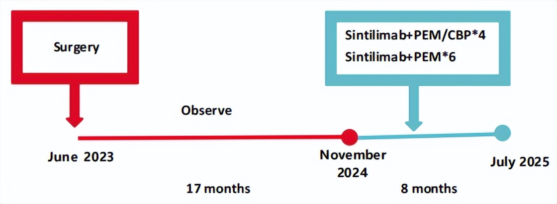 2024.11.19患者出现右侧胸痛,复查胸部CT检查示右侧胸膜肿物,大小约31mmX24mm,右侧4、5肋骨骨质破坏,考虑转移(如图2)。建议患者穿刺活检取病理明确诊断,患者拒绝,经MDT会诊后结合影像学表现及病史考虑为胸膜转移,肋骨转移,分期为rT0N0M1a IVA期,DFS仅仅17个月。2024.12.05起行信迪利单抗联合培美曲塞+卡铂方案治疗4周期,复查胸CT评效PR(如图3)。之后给予信迪利单抗+培美曲塞维持治疗6周期,期间复查CT评效PR(如图3)。目前信迪利单抗+培美曲塞维持治疗中,截止至目前PFS约为8个月,治疗期间未出现明显毒副反应。