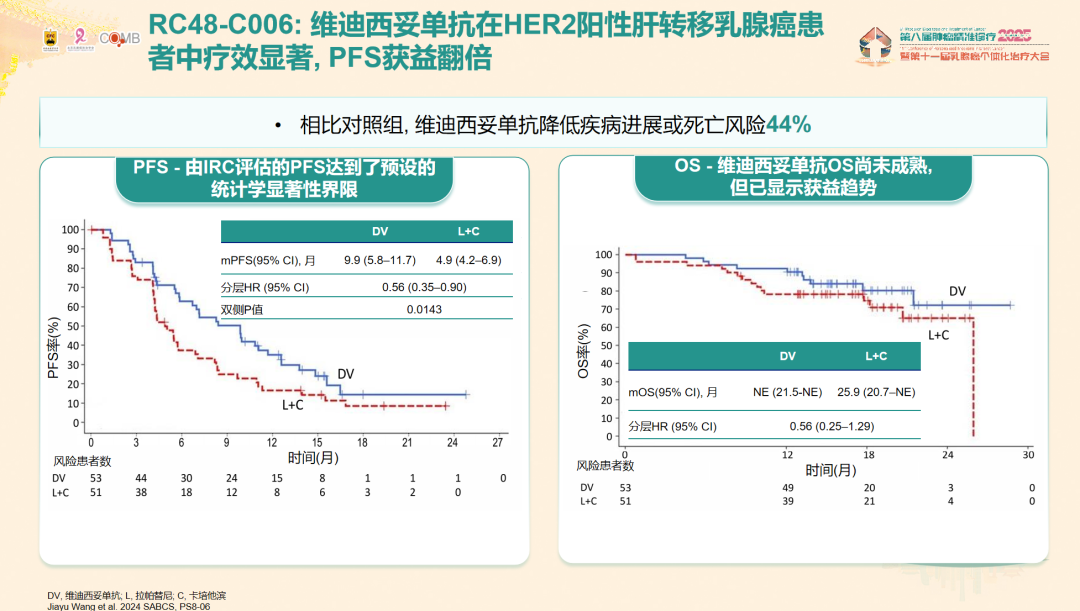 王佳玉教授:RC48-C006是在徐兵河教授领导下,我们团队开展的一项对比HER2靶向ADC药物维迪西妥单抗与传统方案拉帕替尼+卡培他滨治疗晚期伴肝转移的乳腺癌的随机、多中心、开放标签Ⅱ期/Ⅲ期研究[3],该研究分为两个阶段,第一阶段(Ⅱ期研究)并未限制晚期乳腺癌转移部位,我们发现维迪西妥单抗针对肝转移的患者有较好的疗效。基于维迪西妥单抗对肝转移亚组的优异疗效,我们在第二阶段(Ⅲ期研究)中进行了针对伴有肝转移的晚期乳腺癌的疗效验证,主要终点为独立评审委员会(IRC)评估的PFS。Ⅲ期研究最终分析结果显示,相比二线拉帕替尼+卡培他滨治疗,维迪西妥单抗治疗组患者的PFS显著延长,中位PFS分别为9.9个月和4.9个月,疾病进展或死亡风险下降44%(HR:0.561,P=0.0143)。此外,维迪西妥单抗治疗HER2阳性伴肝转移乳腺癌患者安全性可控,为乳腺癌肝转移患者提供了全新的治疗选择。