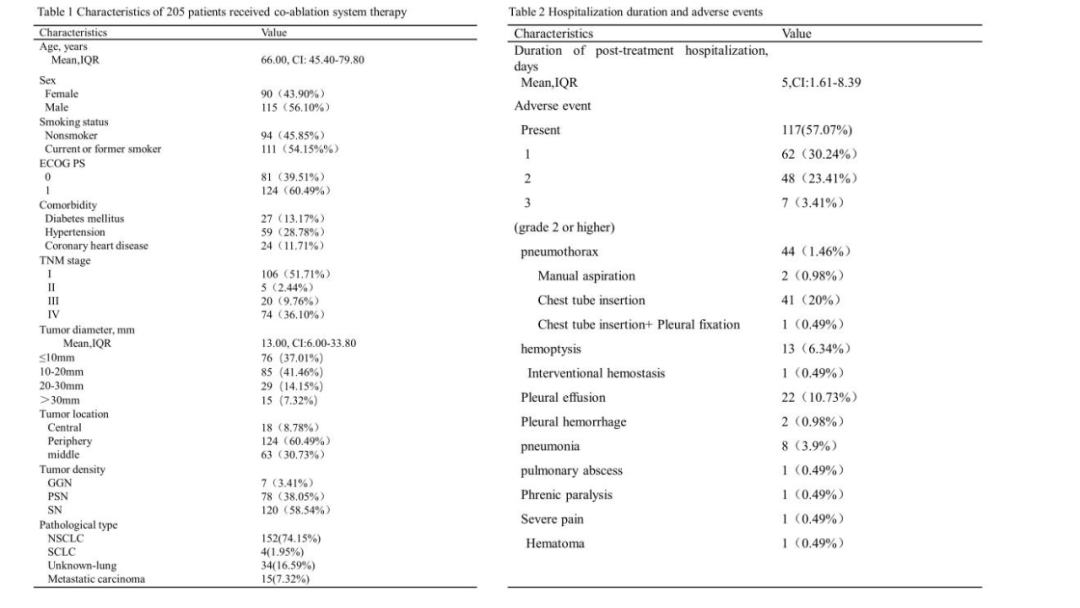 在我们团队的这项临床研究中,前瞻性收集并分析了在上海市肺科医院接受经皮复合消融治疗的205例患者(共212个病灶)的临床数据。结果显示,所有手术操作的成功率为100%,肿瘤完全消融率达97.56%(200/205)。中位随访时间为6个月,对于较小肿瘤(中位直径13mm),其3个月、6个月和12个月的局部肿瘤控制率具有显著优势。肿瘤直径≤3cm患者的无进展生存期(PFS)显著长于肿瘤直径>3cm的患者。安全性层面,26.83%(55/205)的患者发生了≥2级不良事件,主要包括气胸(21.46%)、胸腔积液(10.73%)和咯血(6.34%)。3级并发症发生率较低(3.41%),且无与手术操作相关的死亡病例。多因素分析显示,重度肺气肿(比值比=3.14)、肿瘤大小(比值比=1.09)和肿瘤多发(比值比=4.60)是不良事件的预测因素。