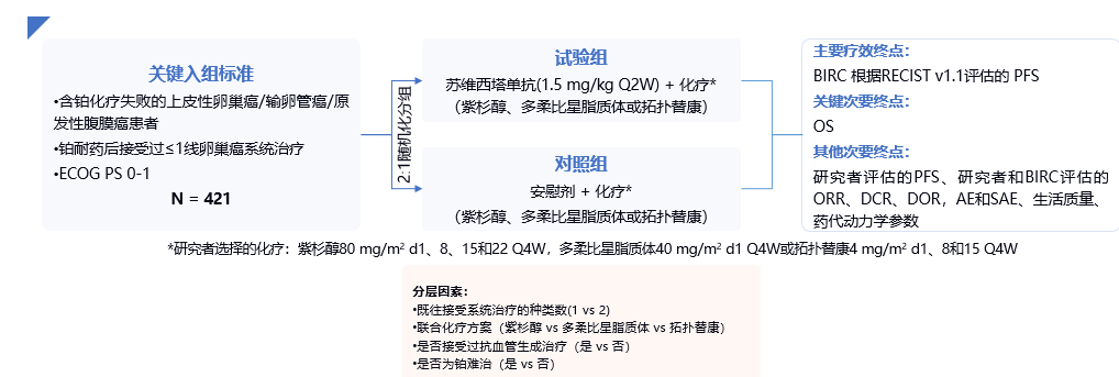 III期SCORES研究的关键入组标准包括:含铂化疗失败的上皮性卵巢癌/输卵管癌/原发性腹膜癌患者,铂耐药后接受过≤1线卵巢癌系统治疗,ECOG PS 0-1。421例患者2:1随机分组进入试验组接受“苏维西塔单抗(1.5 mg/kg Q2W)+化疗(紫杉醇、多柔比星脂质体或拓扑替康),或进入对照组接受安慰剂+化疗。各化疗亚组中,受试者基线特征在两组间分布较均衡。研究纳入了约50%既往使用过PARP抑制剂,约50%既往使用过贝伐珠单抗等抗血管生成药物的患者,约1/3患者既往接受过≥3线系统治疗。