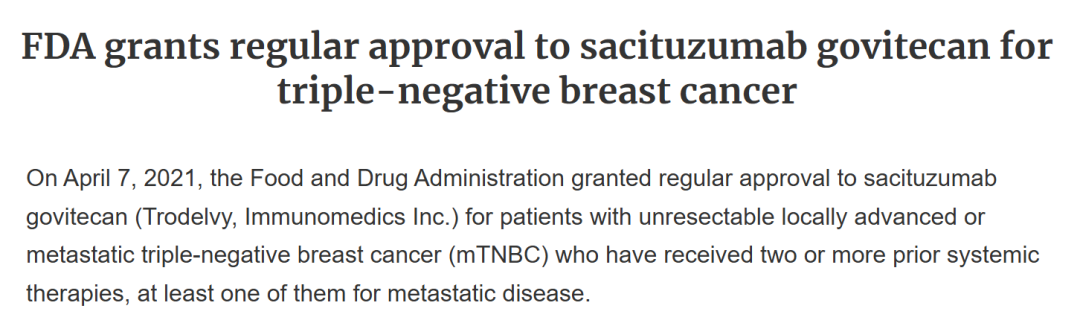 基于ASCENT研究,2021年4月,FDA正式批准SG用于TNBC二线治疗,为临床带来了全新的标准治疗选择。