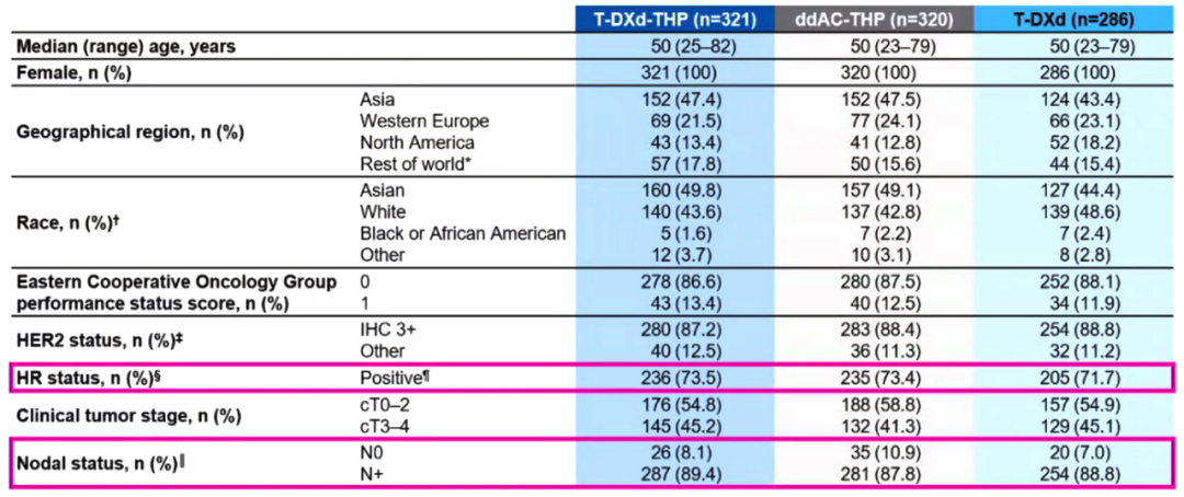 从研究设计和基线特征来看,该研究入组患者总体偏高危,相较于既往报道的同类研究,该研究入组患者的肿瘤分期偏晚、复发风险更高、治疗难度更大,如T-DXd-THP组中cT3-4的比例达45.2%,淋巴结阳性的患者达89.4%;新辅助治疗疗效偏低的HR+患者入组比例也达到了73.5%。
