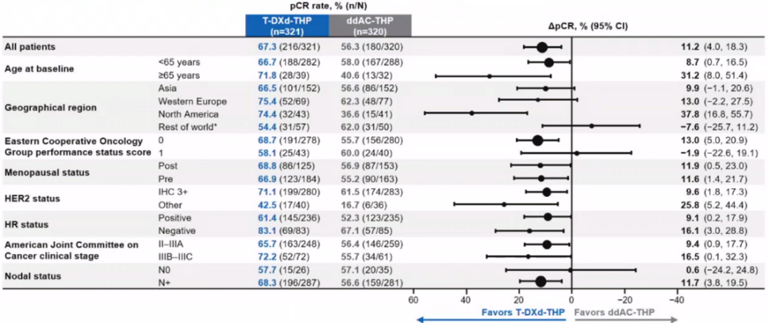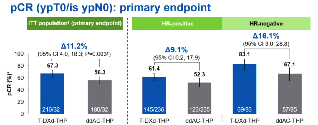此次报道T-DXd-THP对比ddAC-THP的结果令人眼前一亮。首先是T-DXd-THP取得了非常高的pCR率,达到了67.3%,相比对照组(56.3%)的绝对差异达到了11.2%,具有显著统计学意义(95%CI:4.0–18.3;P=0.003)。其中HR+(61.4%vs 52.3%)和HR-(83.1%vs 67.1%)乳腺癌以及不同亚组患者均显示了一致的pCR疗效提升。