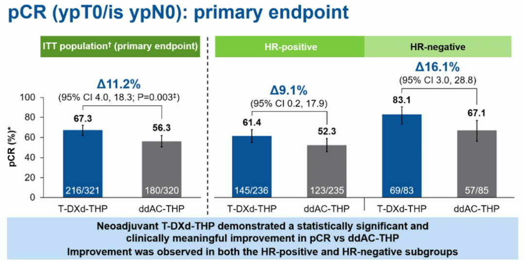 DESTINY-Breast11研究也是备受瞩目的一项研究,是T-DXd在早期新辅助治疗阶段对传统方案发起的挑战,总体结果是非常好的,T-DXd序贯THP(曲妥珠单抗+帕妥珠单抗+紫杉醇)方案,相较剂量密集型多柔比星与环磷酰胺序贯THP(ddAC-THP)方案取得了更好的疗效,达到更好的病理学完全缓解率(pCR,67.3%vs.56.3%),意味着疗效强大的T-DXd能够从治疗晚期患者进到早期治疗,这个好消息让大家非常欣慰。