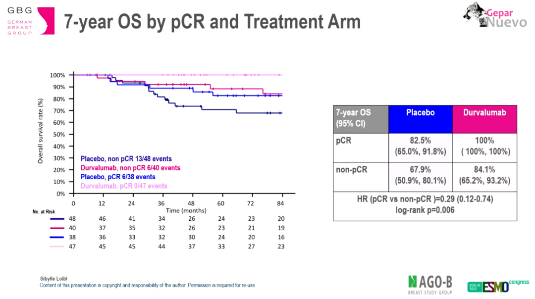 II期的GeparNuevo临床试验评估了在早期三阴性乳腺新辅助化疗的同时,加用免疫检查点抑制剂度伐利尤单抗的价值。尽管加上度伐利尤单抗后,主要研究终点pCR率并没有得到显著提升,但在次要研究终点,包括无浸润性疾病生存(iDFS),无远处复发生存(DDFS)及总生存方面,与安慰剂相比,度伐利尤单抗显著改善了患者生存。此次为更新的长期随访结局报告。