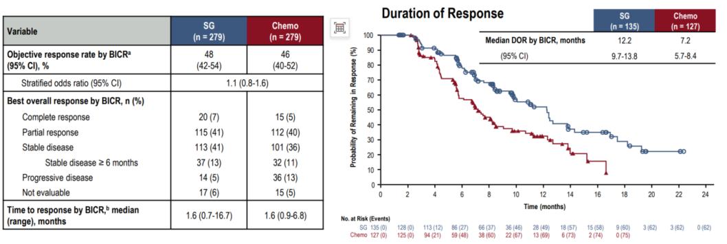 在肿瘤缓解方面,SG与TPC的ORR为48%vs 46%,非常高效;mDOR为12.2个月vs 7.2个月,使患者获得了更长的疾病缓解。