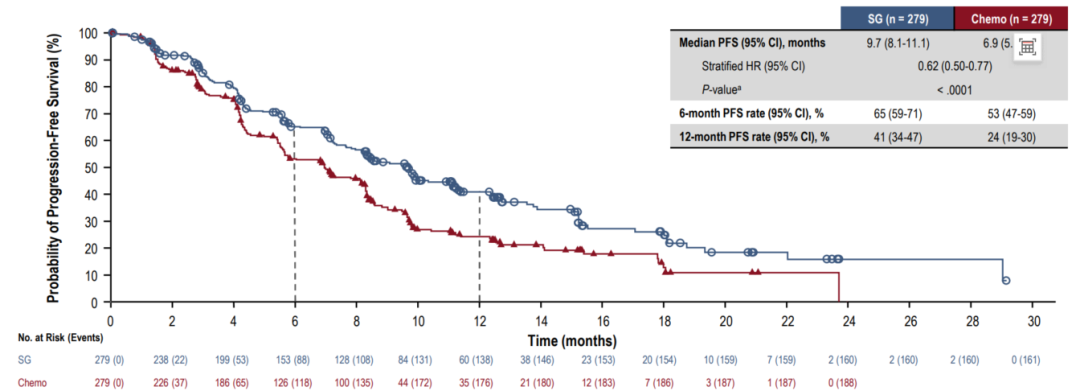 该研究共纳入588例患者,按1:1随机分组,分别予以SG或医生选择的化疗(TPC,包括单药或联合化疗)进行一线治疗。两组各基线水平一致,且贴近临床实践:其中初诊转移约占30%,其余为复发晚期,约20%为根治性治疗结束6-12个月复发患者,约50%为根治性治疗结束后12个月以上复发患者;约60%的患者存在肺转移、约30%存在肝转移、5%存在脑转移。研究的主要终点是盲态独立评审中心(BICR)根据RECIST v1.1评估的PFS;次要终点包括总生存期(OS)、客观缓解率(ORR)、缓解持续时间(DoR)、安全性等。