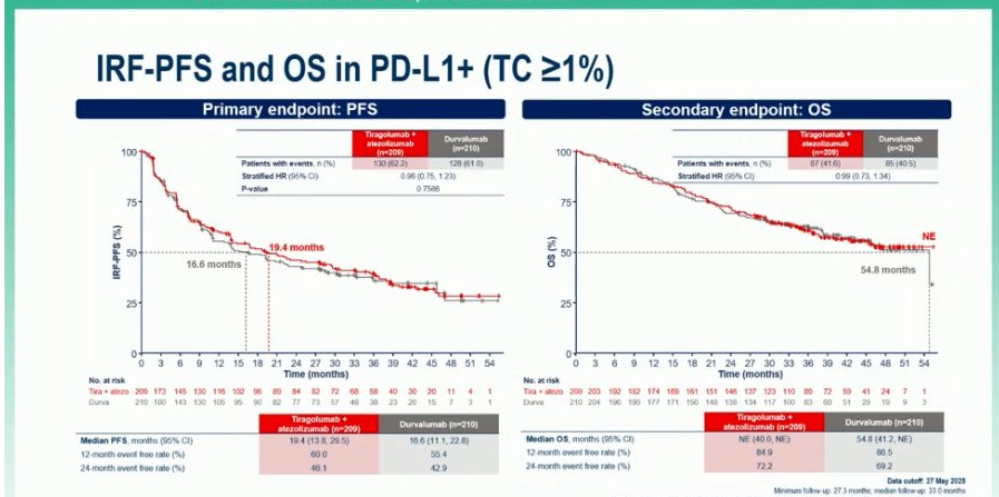 在III期SKYSCRAPER-03试验中,与度伐利尤单抗相比,PD-L1抑制剂阿替利珠单抗联合TIGIT抑制剂替拉戈利单抗的联合治疗并未改善结局。在总体患者以及PD-L1阳性患者中,该联合方案相较于度伐利尤单抗,在主要终点中位无进展生存期(PFS)或中位总生存期(OS)方面均未显示出获益。