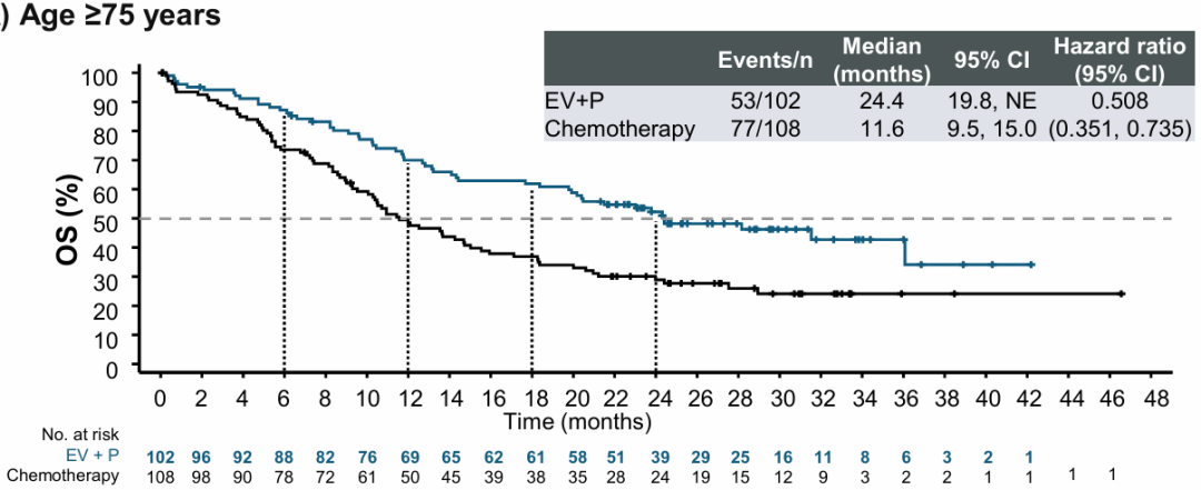 探索性分析结果显示[2],对于老年患者(年龄≥75岁),维恩妥尤单抗联合方案可使中位PFS较化疗实现翻倍,疾病进展或死亡风险降低57%(12.3个月vs 6.0个月,HR 0.43);可使中位OS较化疗翻倍,死亡风险降低49%(24.4个月vs 11.6个月,HR 0.51)。维恩妥尤单抗联合方案可显著改善ORR(66.3%vs 38.3%)和中位DOR(20.2个月vs 7.1个月)。