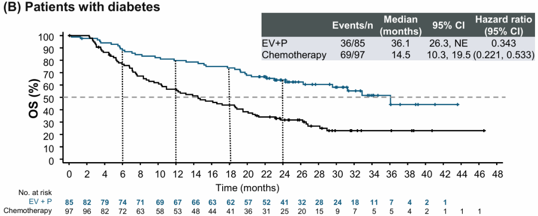 探索性分析结果显示[2],对于基线合并糖尿病的患者,维恩妥尤单抗联合方案的中位PFS是化疗组的4.2倍,疾病进展或死亡风险降低64%(26.3个月vs 6.2个月,HR 0.36);中位OS是化疗组的2.5倍,死亡风险降低66%(36.1个月vs 14.5个月,HR 0.34)。维恩妥尤单抗联合方案的的ORR较化疗实现近乎翻倍(69.9%vs 35.4%),中位DOR是化疗的2.8倍(34.2个月vs 12.4个月)。