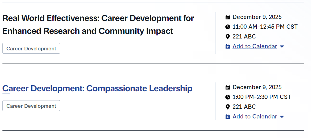 两场职业发展论坛:1、真实世界的有效性:增强研究和社区影响的职业发展;2、职业发展:富有同情心的领导。