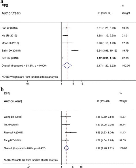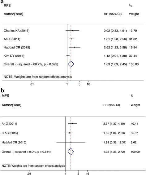 NLR升高的HNC患者和NLR降低者相比,有更高的治疗后复发概率(HR=1.63, 95% CI:1.09–2.45; P = 0.017; I2=68.7%; P=0.022)。