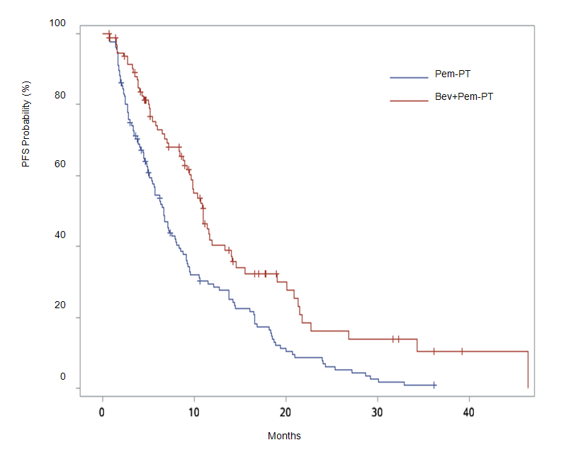 该研究是一个回顾性、非随机对照研究。我们把2012年1月到2017年3月期间接受“培美曲塞+铂类”和“培美曲塞+铂类+安维汀”治疗的晚期NS-NSCLC患者的临床资料进行对比分析。主要终点之一是无进展生存期(PFS),单纯化疗的PFS只有6.6个月,加用安维汀后,中位PFS可以达到将近11个月(图2)。另外一个研究终点是客观缓解率(ORR),化疗联合安维汀的ORR可以达到63.5%,而对照组仅有20.8%。无论是主要终点PFS还是次要终点ORR,都呈现非常理想的数据结果。