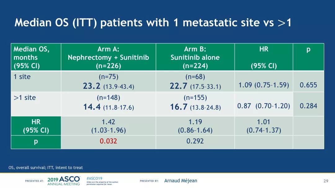 但是,我们还要注意到,对于存在一个风险因素的患者(31.4 vs 25.2个月)以及一个转移病灶的患者(23.2 vs 22.7个月)进行手术并无明显获益;而部分单独靶向治疗发生进展的患者,随后选择减瘤术也获得了更好的总生存(48.5 vs 15.7个月)。也就是说我们可能还需要对中危患者进行更细致的分层分析。这实际上也是去年天津泌尿肿瘤高峰论坛上专家们讨论的焦点,我们还没有更充分的证据和更准确的标准来指导中危人群选择减瘤术。整体上,国内专家相对一致的共识是,减瘤术可一定程度上减小肿瘤负荷、缓解血尿和疼痛等症状;尤其是中低危、可耐受的患者,手术联合靶向治疗对提高患者生存获益和生活质量均有积极意义。