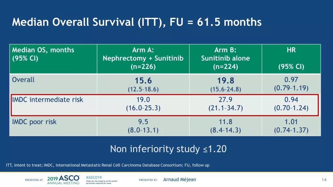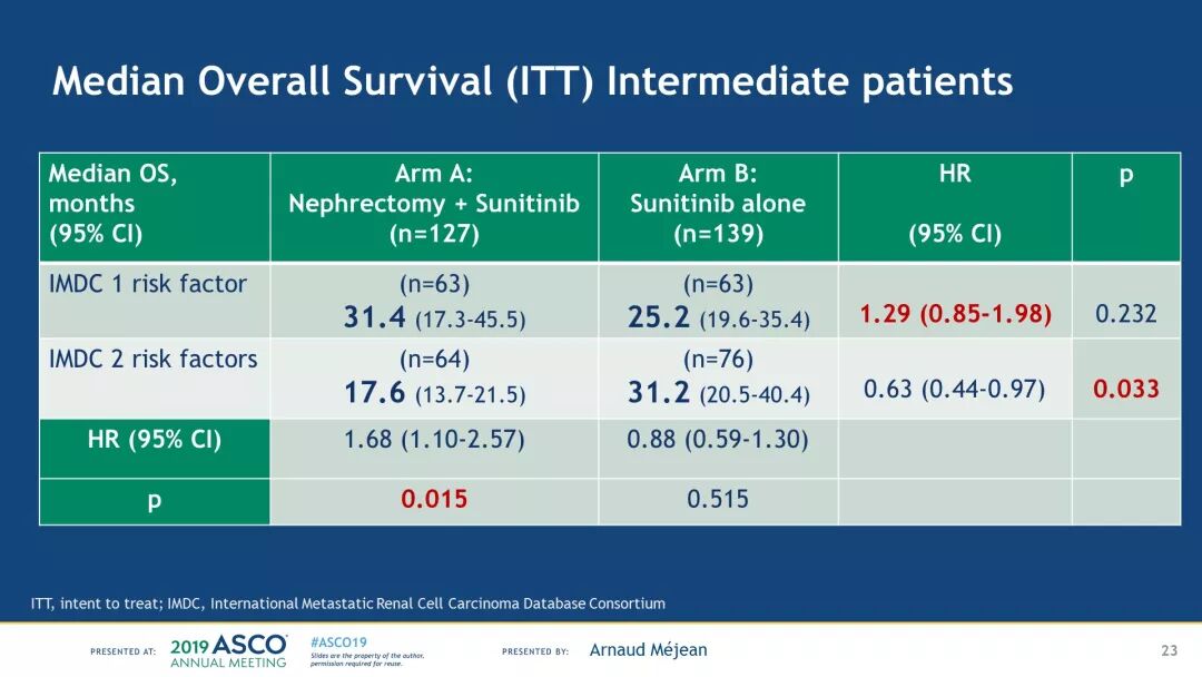 姚欣教授:从一些回顾性的数据分析,以及临床医生的真实世界经验分享来看,不少mRCC患者是可以从减瘤性肾切除术中获益的。与我们传统认知有所不同的是,去年的CARMENA试验结果提示,在MSKCC中高危患者中,靶向+手术治疗的患者相较于单独靶向治疗并不能从手术治疗中得到更多获益。今年ASCO大会上,CARMENA试验对患者重新进行IMDC风险分层的生存分析。其结果提示,在IMDC中危且存在2个风险因素的患者中,手术+靶向和单纯靶向的中位OS分别为17.6个月和31.2个月(HR 0.61,95%Cl 0.41-0.91,p=0.015),肯定了这部分中危患者单独靶向治疗的临床意义。