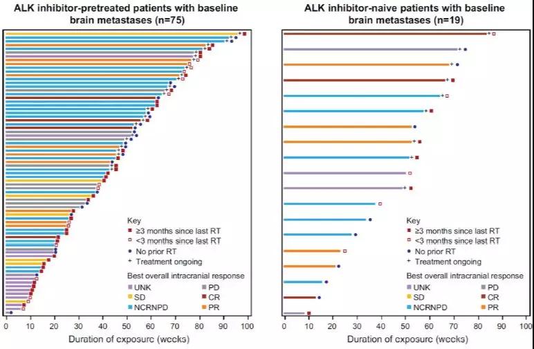 在ASCEND-1的塞瑞替尼I期临床试验中,纳入了94例脑转移患者,回顾性分析中位颅内病灶的应答时间为6.1(95%CI,5.1-30.1)周,与全部入组患者的全身病灶应答时间一致。对既往接受过ALK抑制剂治疗的患者,颅内病灶控制率(IDCR)仍达65.3%(95%CI,53.5-76.0),中位应答持续时间(DOR)为6.9个月;对具有可测量的颅内病灶且既往接受过ALK抑制剂治疗的患者进行分析,IDCR达60.7%(95%CI,40.6-78.5),DOR为11.1个月。基于这些结果,提示塞瑞替尼为既往使用克唑替尼后出现颅内进展的患者提供了很好的治疗选择。
