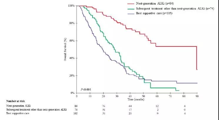 法国的一项真实世界研究中,针对一线使用克唑替尼耐药后的患者,在二线治疗中选择不同的治疗手段,如最佳支持治疗、二代ALK抑制剂、二代ALK抑制剂以外的其他治疗,在二代ALK抑制剂组中采用塞瑞替尼治疗的比例最多,这组患者的OS可达89.6个月,这一结果则提示:后线使用塞瑞替尼能给患者带来明显的生存获益,使ALK融合阳性NSCLC呈现出慢病化的状态,患者能得到长期生存。