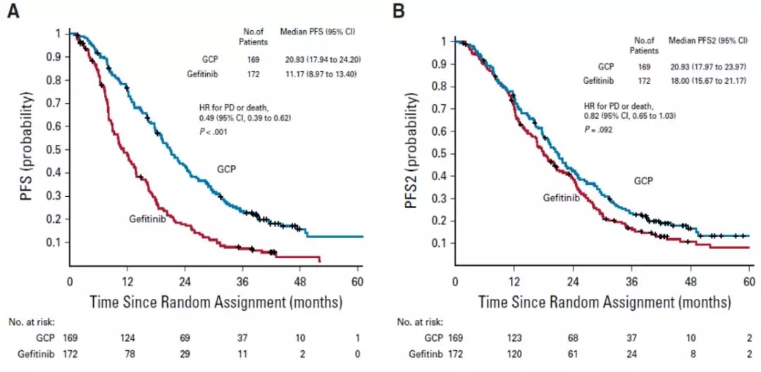 研究方法:这是一项多中心、III期临床研究,共纳入日本47家中心。所有患者均为病理学确认的初治非鳞非小细胞肺癌,除19del或21L858R突变外,非经典突变仅允许18G719A/C/S/和21L861Q的患者入组,患者PS评分0-1分。携带原发性T790M突变的、有症状脑转移的及存在其他恶性肿瘤病史的患者不能入组本研究。随机化前,患者按照性别、临床分期、突变类型及吸烟状态进行分层,并随机分为吉非替尼单药组(250 mg,口服,每日一次)或联合培美曲塞(500 mg/m2)联合卡铂(AUC=5,每三周一次)组,患者至多接受6次化疗后,进行靶向联合培美曲塞的维持治疗。治疗应当持续进行,直至出现不可耐受的毒性反应或疾病进展或患者退出研究。疾病进展后,如研究者认为患者可以继续从治疗中获益,则允许继续接受原方案治疗,吉非替尼单药组患者进展后,优先采用以培美曲塞联合铂类的化疗方案。第一年每2个月进行一次疗效评估,随后每3个月进行一次疗效评估。研究采用EORTC-QLQ-C30来评估患者生存质量。本研究的主要研究终点为复合终点:PFS、PFS2及OS,次要研究终点为ORR、安全性及生活质量。PFS定义为从随机化开始至疾病进展或患者死亡的时间,PFS2定义为从随机化开始至二线治疗进展的时间(联合治疗组PFS=PFS2),但随后作者发现,PFS2的定义在吉非替尼单药组包括了一线进展后、二线启动前的这部分时间,因此,修订后的PFS2将这部分时间去掉,OS定义为随机化开始至患者出现死亡事件。