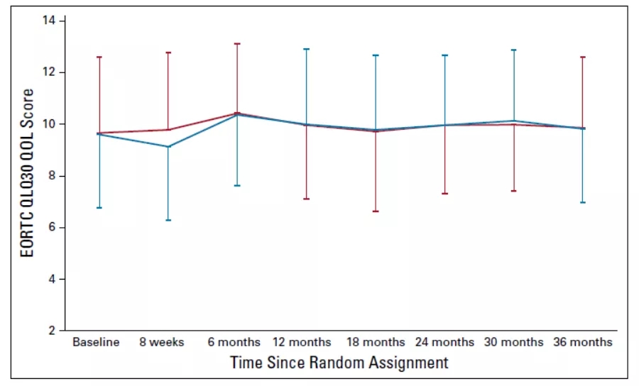 345例患者中,80.9%(279例)患者完成了基线及至少一次治疗过程中生活质量问卷。患者基线生活质量评分相似。第8周时,患者生活质量评分有显著下降,但到了第6个月及以后,两组之间的生活质量评分不存在显著差异(图6)。