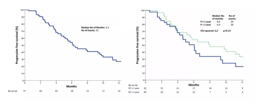 T-DM1可改善HER2阳性转移性乳腺癌患者的PFS和OS,目前主要用于曲妥珠单抗+帕妥珠单抗+紫杉醇后的二线治疗,但相关的疗效数据较少。意大利热那亚大学Benedetta C.报告的回顾/前瞻性多中心研究(GIM-14/BIOMETA)中[1],搜索了2013年11月15日至2018年5月31日期间,“曲帕+紫杉”一线治疗进展后接受T-DM1二线治疗的病例资料,在445例HER2转移性乳腺癌中,共有77例符合分析条件。结果显示:中位随访7个月时,mPFS为6.3个月(95%CI,4.8-7.7),mTTF为6.2个月(95%CI,4-8.6)。超过三分之一的患者(37.6%;n=29)有延长治疗(PDT),ORR为27.1%。在数据截止时,OS未达到,1年OS率为82%。