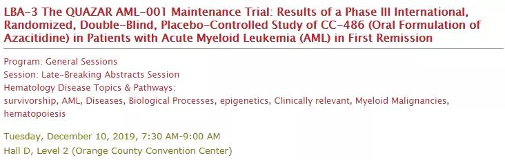 QUAZAR AML-001 Maintenance 研究:CC-486在急性髓系白血病患者首次缓解后维持治疗中的研究