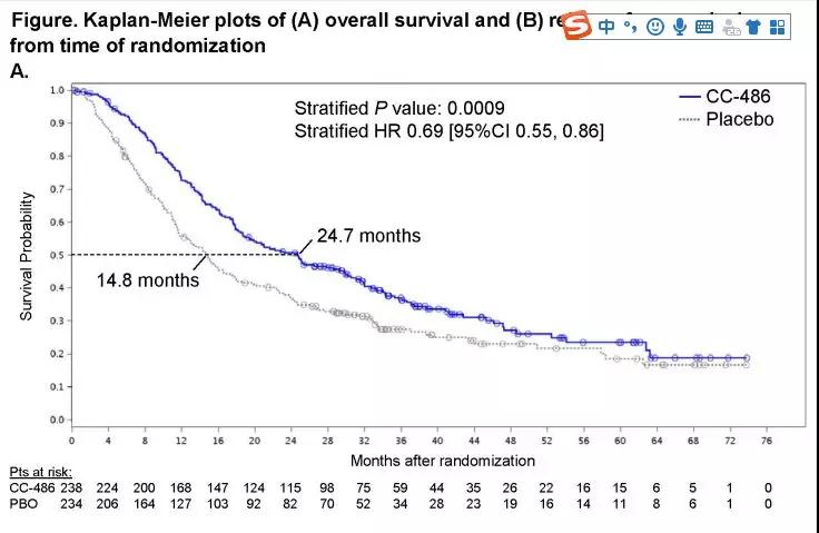 中位随访时间为41.2个月,结果显示:①与安慰剂组相比,CC-486组患者的总体生存(OS)得到显着改善,其中位OS分别为24.7个月和14.8个月(HR 0.69 [95%CI :0.55~0.86],P=0.0009)(详见图A)。②在无复发生存(RFS)方面,CC-486组也明显占优,中位RFS分别为为10.2个月(CC-486组)及4.8个月(安慰剂组)(HR 0.65 [95%CI:0.52~0.81],P=0.0001)(详见图B)。③无论患者的细胞遗传学分层、既往接受过的巩固治疗次数以及CR/CRi状态如何,CC-486均能带来OS和RFS获益。④在健康相关的生活质量(HRQoL)方面,CC-486对HRQoL并无不利影响,与安慰剂组对比无差异。⑤在安全性方面,CC-486组和安慰剂组最常见的不良事件(AEs)为1~2级胃肠道不良反应,包括恶心(CC-486组64%,安慰剂组为23%)、呕吐(CC-486组为59%,安慰剂组为10%)和腹泻(CC-486组 49%,安慰剂组为21%)。最常见的3~4级AEs包括中性粒细胞减少症(CC-486组41%;安慰剂组24%)、血小板减少症(CC-486组23%,安慰剂组22%)和贫血(CC-486组14%和,安慰剂组13%)。严重的AEs不常见,很少因AEs导致治疗中断。